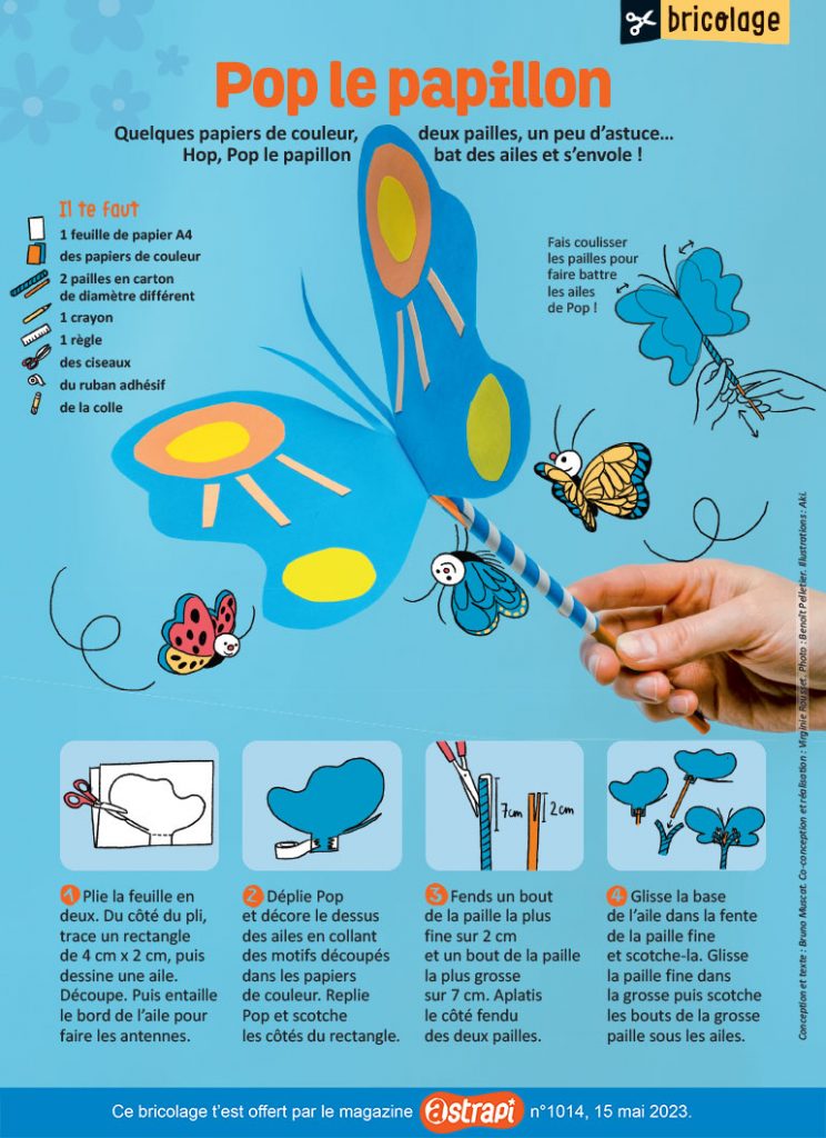 Voilà les beaux jours ! De jolis papillons volètent d’une fleur à l’autre. Pour te mettre dans l’ambiance, Astrapi t’explique comment créer un papillon qui bat des ailes avec des papiers de couleur, deux pailles et… un peu d’astuce !