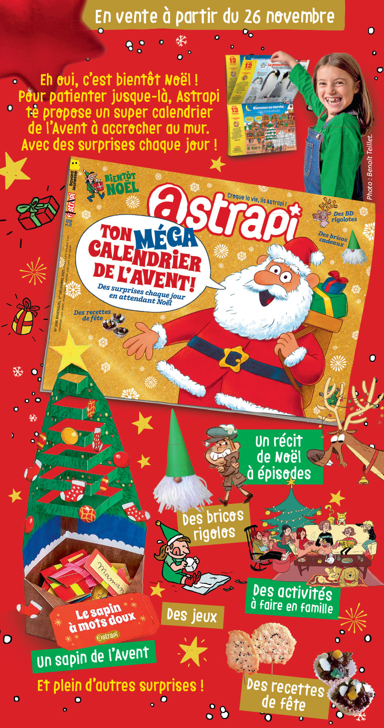 Eh oui, c’est bientôt Noël ! Pour patienter jusque-là, Astrapi te propose un super calendrier de l’Avent à accrocher au mur. Un récit de Noël en quatre épisodes, des bricos rigolos, des recettes de fête, des jeux, des activités à faire en famille… le MÉGA calendrier te réserve une surprise chaque jour !
