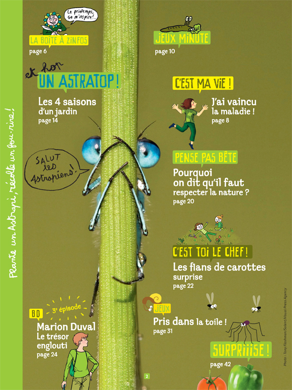 - L’Astratop : “Les quatre saisons d’un jardin.” Pour savoir comment vivent ensemble les légumes, les fruits et des tas de petites bêtes, Astrapi emmène ses lecteurs dans un jardin pendant toute une année. Après avoir testé leurs connaissances dans le “jardi-quiz”, ils apprendront aussi comment planter des tomates, fabriquer un piège à limaces ou nourrir les oiseaux… En avant pour un bon bol d’air !